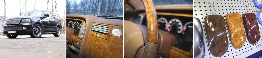 Преизведена иммерсионная печать (аквапринт) всего салонного декора Линкольн Навигатор под корень светлого дерева с глянцевым финишным покрытием.