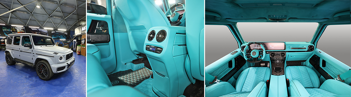 Этот Mercedes-Benz G-Class теперь играет в другой лиге — Тиффани внутри! Детали? Мы не просто проработали их — мы подчеркнули их так, что они заявляют о статусе громче, чем рев его двигателя: ту полностью все выполнено в стиле Тифани, начиная от потолка и заканчивая порогами. А детали, которые даже самый богатый Гелик в комплектации Edition One имеет пластиковые - мы тоже все перетянули в кожу (рулевая колонка, пороги, тыльная часть сидений, тыльная часть центральной консоли, боковые панели передних сидений и огромная масса другого пластика, одни только кожаные борта багажника чего стоят!
